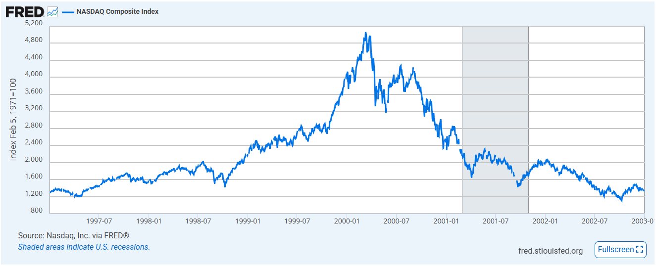 Graph depicting the bubble period and crash of the Nasdaq Index during the Dot-Com Boom of the early 2000s.
