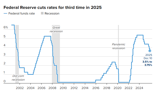 The decision marked the central bank’s third consecutive rate cut, bringing total reductions since September to 0.75 percentage points and leaving the federal funds rate in a range of 3.5% to 3.75%. In October it was hovering around 3.875%.