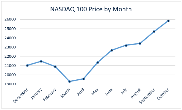 The tech-heavy Nasdaq 100 index continues its bull run, reaching 25,858 points to finish October up by 4,845 points for 2025.