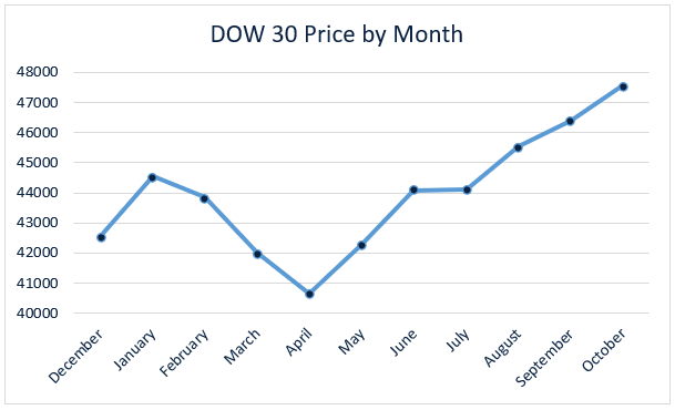 The Dow 30 finished the month at 47,562, up over 5,000 points from the beginning of the year.