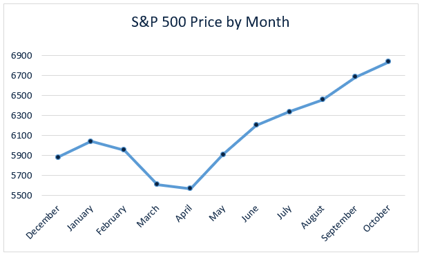The S&P 500 closed out the month at 6,840 points, a gain of 958 points for the year.