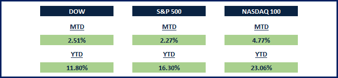 The Dow Jones Industrial Average, S&P 500 and Nasdaq 100 indices continued their advance this month, with the three indices up Year-To-Date 11.8%, 16.3% and 23.06% respectively.